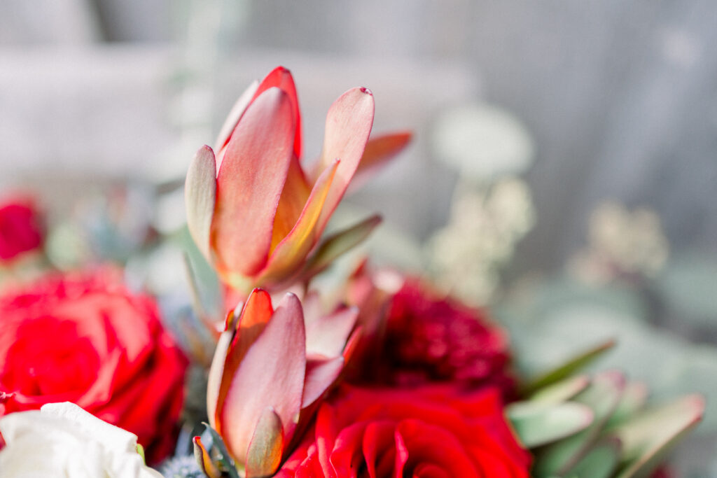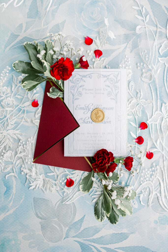 Her updated color palette leaned into winter tones— rich blues, deep reds, burgundies, and soft greens— with touches of gold woven throughout the details. The result felt timeless, elegant, and perfectly suited for a December wedding.