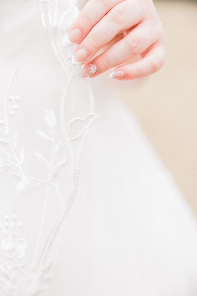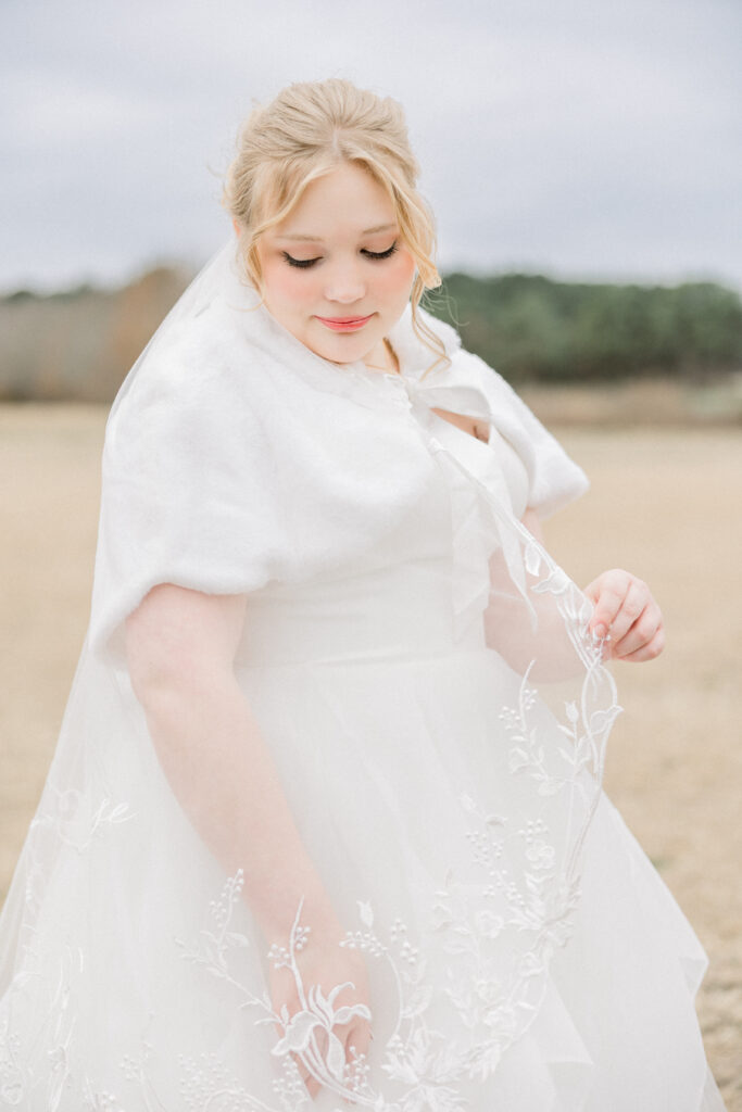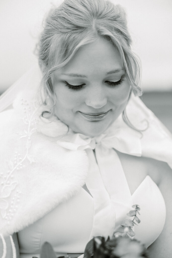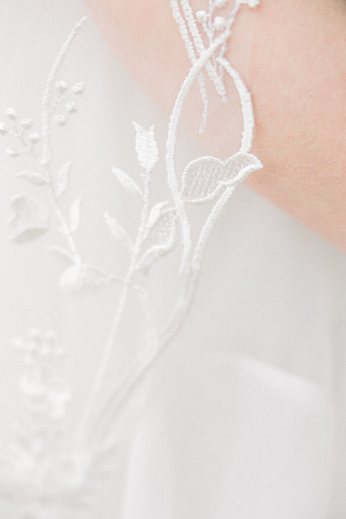 Emily paid incredible attention to the details. Her wedding day look was absolutely stunning. She truly looked like the perfect winter bride. Her veil featured delicate appliqué embroidery with both her and Chase’s names stitched into the design, making it a meaningful piece she’ll always have from their day.
