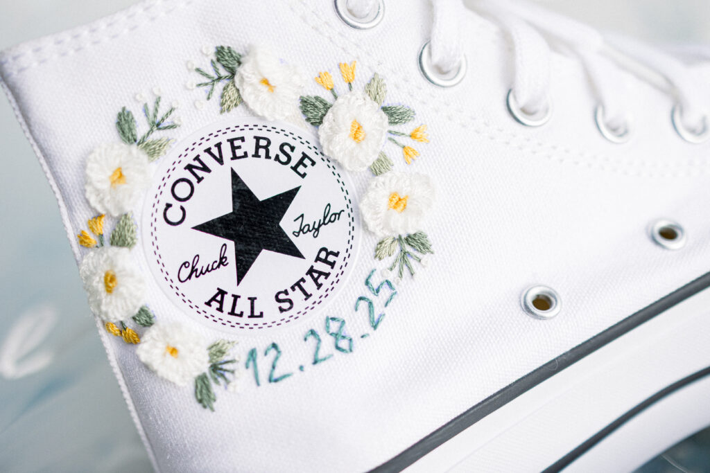 She also wore custom embroidered Converse shoes, which she kept on throughout the day, adding both comfort and personality to her bridal style.